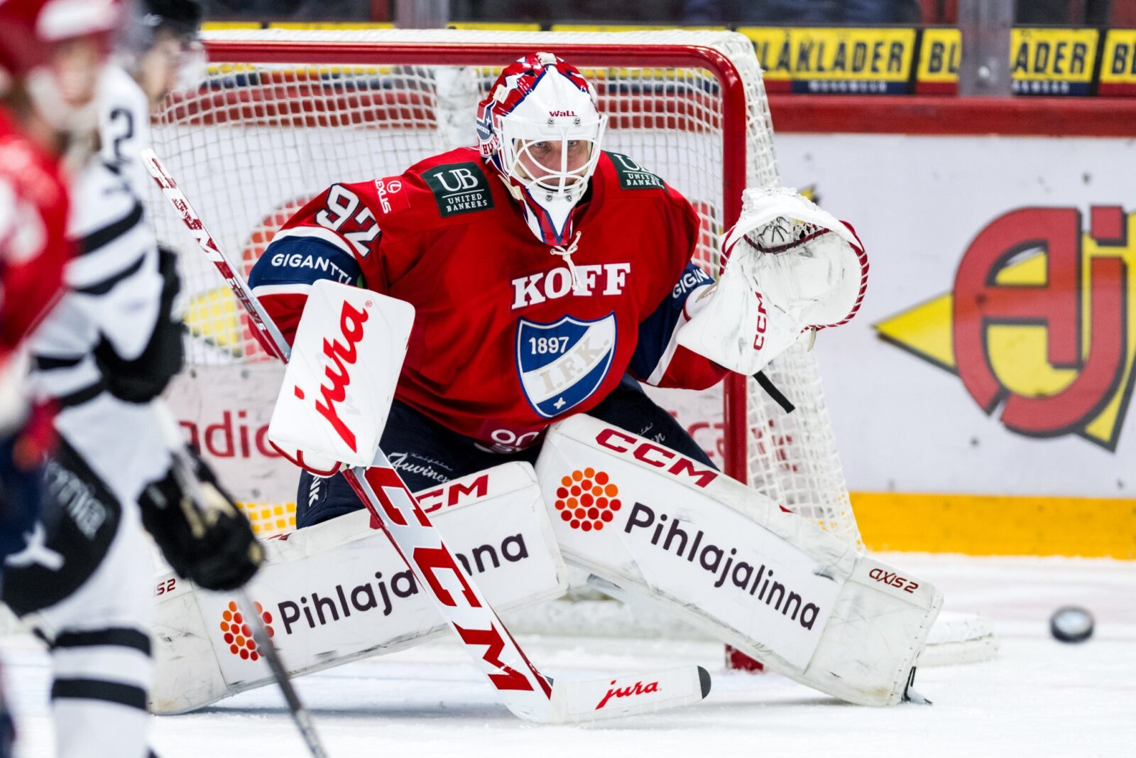 Stadilaisten byyrissä pelaa Niko Hovinen. Varalla on Kiekko-Vantaasta Roope Taposen loukkaantumisen vuoksi hälytetty Eemil Vinni.
