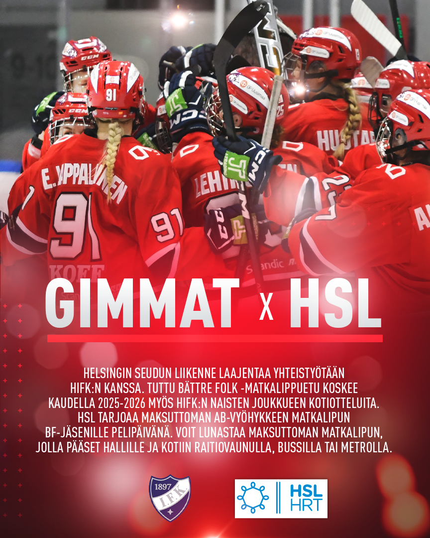 Gimmoissa tullaan näkemään kuusi uutta peluria alkavalla kaudella. Niemen mukaan pelaajat, jotka hakeutuvat HIFK:hon, tietävät kovan vaatimustason ja haluavat tulla Helsinkiin kehittymään.- Mielenkiintoinen Suomen ja Ruotsin passin omaava hyökkääjä Hilda Pakarinen Arhammer (19) siirtyy Tukholman SDE:stä Helsinkiin. Hilda pelasi viime kaudella Ruotsin kovatasoista SDHL- sarjaa ja tavoittelee tulevaisuudessa paikkaa kilpailullisessa USA:n yliopistosarjassa. Gimmoissa Hildalla on mahdollisuus isompaan rooliin ja ottaa askel eteenpäin kiekkoilijana.- Maalivahtiosastolle saamme myös täydennystä, kun Janika Järvikari (25) palaa Helsinkiin pelattuaan muutaman kauden Rokissa ja HPK:ssa. Järvikaria ja viime vuonna jo HIFK:ssa torjunutta Nelli Niemistä (18) haastamaan saatiin stadilainen Lilli Packalen (21).- Kolmas pelaaja, joka nousee omalta junioripolulta liigajoukkueeseen, on Sara Loikkanen (17). Sara pelasi viime talvena N18 MM-kisat Vantaalla ja monipuolisena pelaajana pystyy auttamaan joukkuetta niin keskellä kuin laidassa. Jyväskylästä Helsinkiin muuttanut Tytti Teräväinen (17) täydentää puolustusosion. Tytti on tottunut pelaamaan poikien kanssa, joten pelinopeus on hyvällä tasolla.Gimmojen kotiavaus pelataan 20. syyskuuta Pirkkolassa. Kaudella 2025-2026 Bättre Folk -jäsenet saavat maksuttoman AB-vyöhykkeen HSL-matkalipun myös Gimmojen kotiotteluihin.Osta Gimmojen kausikortti! TicketmasLiity Bättre Folk -jäseneksi HIFK-sovelluksessa.