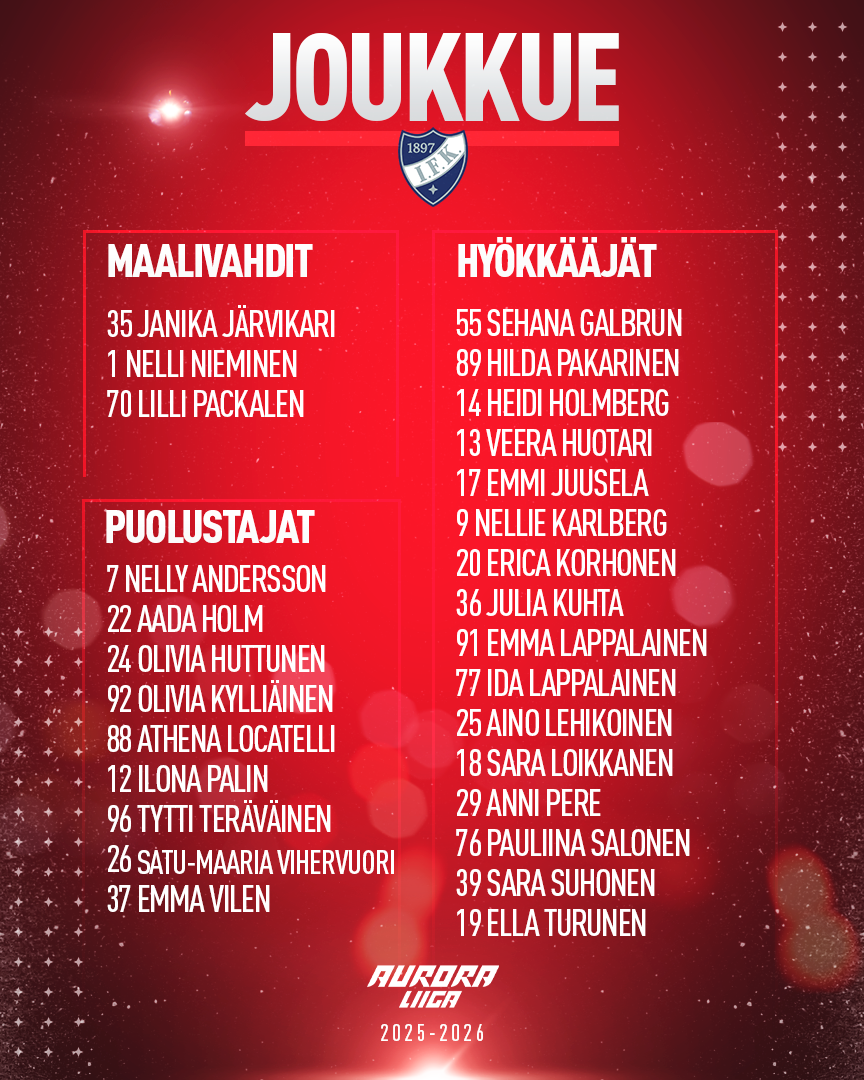 Joukkue kaudella 2025-2026| Pelinumero | Nimi | Syntymävuosi | Edellinen seura |