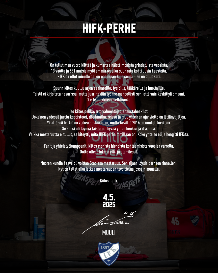 Hyökkääjä Micke-Max Åstenin sopimus HIFK:n kanssa päättyy kauteen 2024-2025. Vuodesta 2011 lähtien "Muuli" on edustanut koko ammattilaisuransa HIFK:ta.- "Muuli" on tuonut omalla panoksellaan joukkueelle energiaa ja periksiantamatonta asennetta pelistä toiseen vuosien ajan, ja on ollut esimerkillinen joukkuepelaaja ja -kaveri niin jäällä kuin sen ulkopuolelle pyrkien huomioimaan kaikki joukkueen jäsenet, urheilujohtaja Janne Pesonen kertoo.Åstenista kasvoi vuosien varrella kulttipelaaja HIFK-yhteisölle ja koko Liigalle. Omien rakastama ja vastustajien vihaama hyökkääjä pelasi kaikkiaan 631 ottelua HIFK:ssa ja keräsi 39+60=99 tehopistettä. Kovista taklauksistaan, uhrautuvasta puolustupelistään ja viekkaasta suustaan tunnettu voimahyökkääjä merkkautti pelaamissaan matseissa 623 rangaistusminuuttia.- Liityin HIFK:hon syksyllä 2011 ja "Muuli" oli joukkueemme nuorimpia pelaajia. Oli jo tuolloin selvää, että HIFK merkitsee hänelle paljon, ja hän on valmis tekemään kaikkensa joukkueen puolesta, Pesonen muistelee.- Varmasti kaikilla tulee ikävä "Muulia", mutta onneksemme elämää on myös kopin ulkopuolella ja mies pysyy sydämissämme myös jatkossa. Jos minulta kysytään niin numeroa 45 ei tule kukaan muu käyttämään ainakaan vähään aikaan. Uskon, että myöskään huolto ei tule luovuttamaan numeroa kenellekään. Muulin tilastot HIFK:ssaKaudet 2011-2025, yhteensä 13 kauttaRunkosarjaOttelut: 541 (7. eniten HIFK:n historiassa) Pisteet: 32+47=79 Rangaistusminuutit: 555 (8. eniten HIFK:n historiassa)PudotuspelitOttelut: 90 (2. eniten HIFK:n historiassa) Pisteet: 7+13=20 Rangaistusminuutit: 68 (8. eniten HIFK:n historiassa)YhteensäOttelut: 631 (7. eniten HIFK:n historiassa) Pisteet: 39+60=99 Rangaistusminuutit: 623 (7. eniten HIFK:n historiassa)