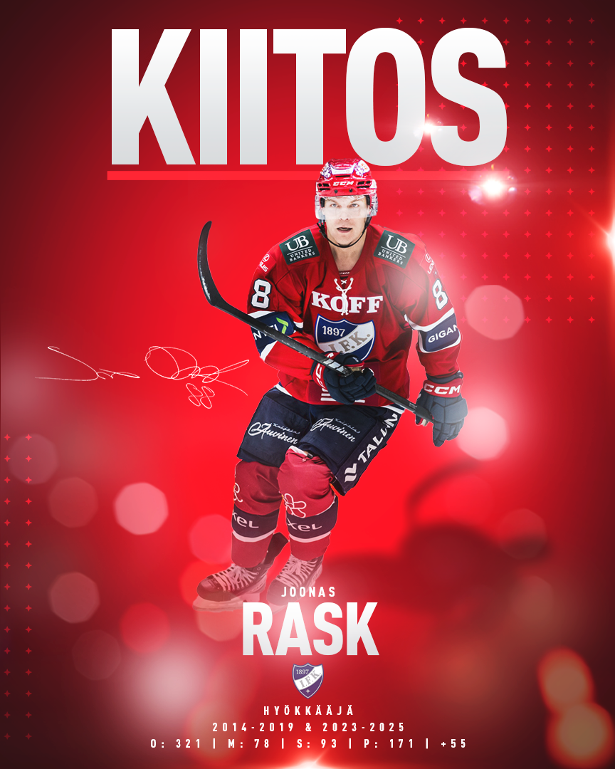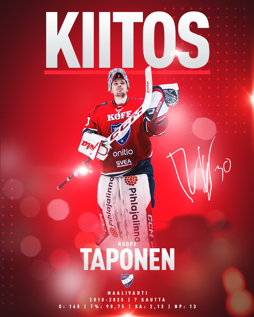 Maalivahti Roope Taposen ja hyökkääjä Joonas Raskin sopimukset HIFK:n kanssa päättyvät kauteen 2024-2025.- Haluan kiittää HIFK:n puolesta yhteisistä vuosista, sitoutumisesta ja panoksesta joukkueen eteen, ja toivottaa onnea ja menestystä tulevaisuuteen, urheilujohtaja Janne Pesonen viestittää.Roope "Tapsa" TaponenNummelan Palloseuran kasvatti liittyi HIFK:n organisaation kaudella 2018-2019. Taponen vartioi Kollien maalia puolitoista kautta ennen lainapestiään Mestikseen ja Joensuun Kiekkopoikiin. Kaudet 2020-2022 Taponen pelasi lainalla Mestiksessä Kiekko-Espoon maalinsuulla, ja kuului sarjan parhaisiin maalivahteihin merkkauttamalla sarjan parhaan torjuntaprosentin ja päästettyjen maalien keskiarvon.Taponen oli lainalla Ilveksessä osan kaudesta 2021-2022 ja Liigadebyytti tuli lokakuussa 2021 tamperelaisten riveissä. ”Tapsa” pelasi myös yhden pudotuspeliottelun HIFK:ssa samalla kaudella.Kaudella 2022-2023 Taponen murtautui Liigan maalivahtieliittiin 21-vuotiaana. ”Tapsa” pelasi 41 runkosarjaottelua päästäen keskimäärin 1,96 maalia ottelua kohden torjuntaprosentin ollessa 91,4.Taponen on kuulunut nuorisomaajoukkueiden vakiokalustoon ja oli voittamassa U20-ikäluokan MM-pronssia vuonna 2021.HIFK:ssa Taponen pelasi kaikkiaan 108 runkosarjaottelua sekä 15 pudotuspelimatsia.Seitsemän HIFK-kauden aikana Taponen muistetaan yhteisön parissa erityisesti valloittavasta hymystään, päättymättömästä positiivisuudestaan ja siitä, kuinka "Tapsalla" oli aina aikaa punapaitaisille kannattajille.Kiitos, Tapsa!Joonas "Rasse" RaskRask siirtyi ensimmäistä kertaa HIFK:hon kesällä 2014 ja Savonlinnassa syntynyt SaPKo-kasvatti pelasi viisi kautta Stadissa. Ensimmäisen stinttinsä aikana "Rasse" pelasi HIFK:ssa 226 runkosarjaottelua tehoilla 61+78=139 ja 61 pudotuspeliottelua pistesaldolla 16+31=47. Rask voitti SM-hopeaan kaudella 2015-2016 sekä pudotuspelien syöttöpörssin. Kaudella 2017-2018 Rask voitti joukkueen kanssa SM-pronssia.Kahden viimeisen kauden aikana "kasikasi" pelasi HIFK:ssa 95 runkosarjamatsia (17+15=32) ja ansaitsi päättyneen kauden aikana kolmannen tähden hihaansa. Yhteensä Raskilla on 321 runkosarjaottelua sekä 71 pudotuspelimatsia HIFK-paidassa. "Rasse" on HIFK:n kaikkien aikojen pudotuspelitilastoissa toisena sekä pistepörssissä että syöttöpörssissä tehoin 18+31=49.Nordiksella Rask muistetaan ennen kaikkea periksiantamattomana taistelijana sekä poikkeuksellisesta tavastaan ottaa fanipääty haltuun tehdyn maalin jälkeen.Kiitos, Rasse!