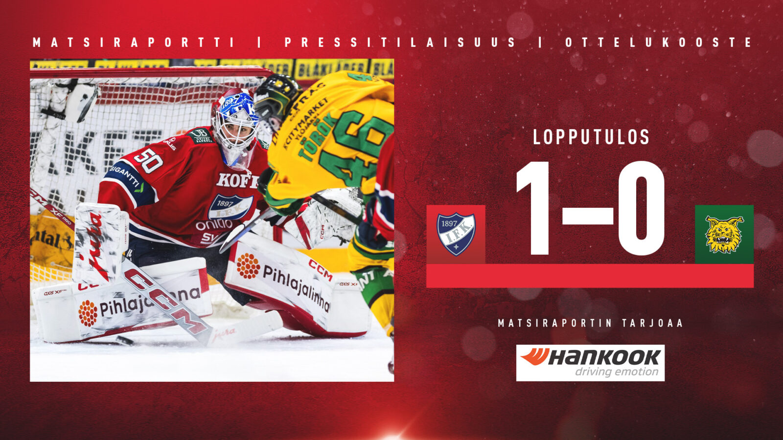 Joukkue otti kolmannen peräkkäisen kolmen pisteen voittonsa tulikuumassa ottelussa Nordiksella. Tällä kertaa kotiyleisön edessä värikkäiden vaiheiden jälkeen kaatui Ilves. Voittomaalista vastasi tšekkihyökkääjä Petr Kodýtek. Ensimmäisessä erässä loukkaantuneen maalivahti Hugo Alnefeltin tilalle tolppien väliin luistellut slovakialainen Rastislav Eliáš piti uransa ensimmäisen nollapelin Liigassa. Joukkueet kohtaavat heti huomenna uudestaan Tampereella.