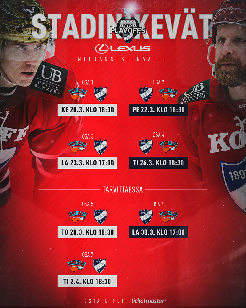 Tänään se vihdoin käynnistyy - Stadin Kevät on täällä!HIFK aloittaa pudotuspeliurakkansa, kun neljännesfinaalisarja Pelicansia vastaan polkaistaan käyntiin Lahdessa. Paras seitsemästä -ottelusarjan ensimmäinen osa alkaa klo 18:30.Ottelu on katsottavissa suorana MTV Katsomo+ Urheilu -tilauksella. Ottelun voi kuunnella suorana myös Classic Hits -radiokanavalla ja Suplassa HIFK:n oman Ilmari Pitkäsen selostamana.Rask ohittaa KortelaisenJoonas Rask pelaa illalla 62. pudotuspeliottelunsa HIFK-paidassa ja nousee yksin seuran kaikkien aikojen tilastossa sijalle 10 ohi seuralegenda Mika Kortelaisen.Tässä kuussa 34 vuotta täyttävä Rask on korkealla muissakin seuran sisäisissä pudotuspelitilastoissa. Tämän kevään aikana jo yksi tehty maali nostaisi hyökkääjän tasalukemiin takavuosien tsekkivirtuoosi Jan Calounin kanssa. OTTELUT1. Pertti Lehtonen 97