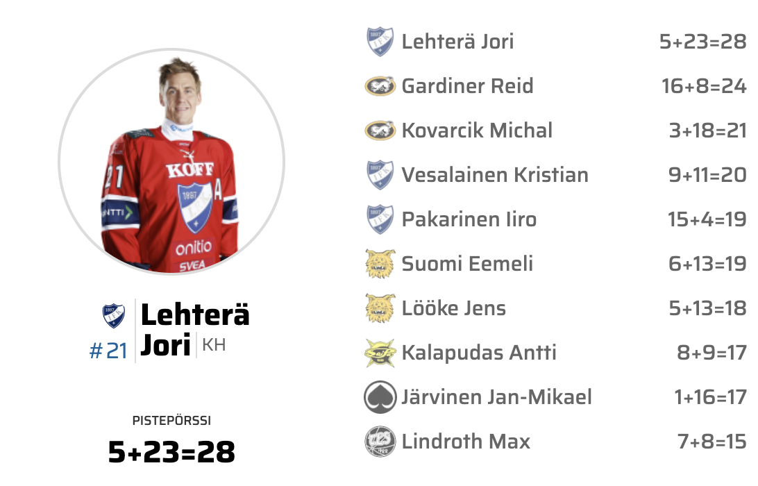 Iskuun ovat yltyneet myös yksilöt. Sentteri Jori Lehterä pitää pistepörssin kärkisijaa itsellään. Lehterän ketjun laitahyökkääjät Kristian Vesalainen ja Iiro Pakarinen löytyvät sijoilta neljä ja viisi.