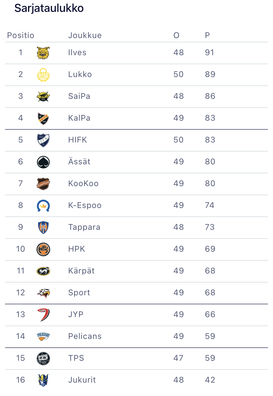 Kolmas matsi neljään päivään. 20 tuntia edellisen ottelun päättymisestä. Viikon ensimmäiset sarjapisteet vielä ansaitsematta.Siinä stadilaisten lähtökohtia lauantai-iltaan, kun Kärpät isännöi viikon päättävää vääntöä Oulun Raksilassa.Kärpät puolestaan pelaa tänään viikon toisen matsinsa. Keskiviikkona edellisen kerran sarjapisteistä pelannut oululaisnippu taipui kotonaan Pelicansille lukemin 4–7.HIFK on tämän viikon tappioiden myötä tippunut sarjan sijalle viisi. Kolme pistettä Oulusta olisi enemmän kuin tervetullut tuliainen taistelussa pääsystä takaisin neljän parhaan sakkiin.Kärpät lähtee iltaan sijalta 11. Nimimiehiä pursuava joukkue hakee vielä parasta kuntoaan kevään kynnyksellä ja hamuaa vähintään yhtä kipeästi sarjapisteitä kuin illan vastustajansakin. Pudotuspeleistä ulos pullahtaminen ei takuulla pohjoisen ylpeydelle sovi.Pörssikärkiä kaukalossaTänään Oulun Energia Areenalla kohtaa kauden kuumimmat nimet. Pistepörssin kärkipaikkaa jakaa HIFK:n Jori Lehterä sekä Kärppien Michal Kovarcik tasapistein. Maalipörssin kärkipaikkaa hallinnut Iiro Pakarinen on tehnyt tällä kaudella kaksi maalia Kärppien verkkoon. Maalipörssin kakkonen, Kärppien Reid Gardiner, on niin ikään osunut tällä kaudella kahdesti otteluissa HIFK:ta vastaan.HIFK tänäänHIFK joutuu tekemään muutoksia kokoonpanoonsa hyökkääjä Kasper Lundellin loukkaannuttua eilisessä ottelussa. Puolustaja Niklas Nykyri on kuntoutunut pelikondikseen ja nousee mukaan pelaavaan kokoonpanoon. Puolustaja Einari Luhanka nähdään tänään neloshyökkäysketjun oikeassa laidassa.Positiivista on myös maalivahti Niko Hovisen paluu. Roope Taponen pitää kuitenkin paikkansa aloittavana veskarina. MAALIVAHDIT