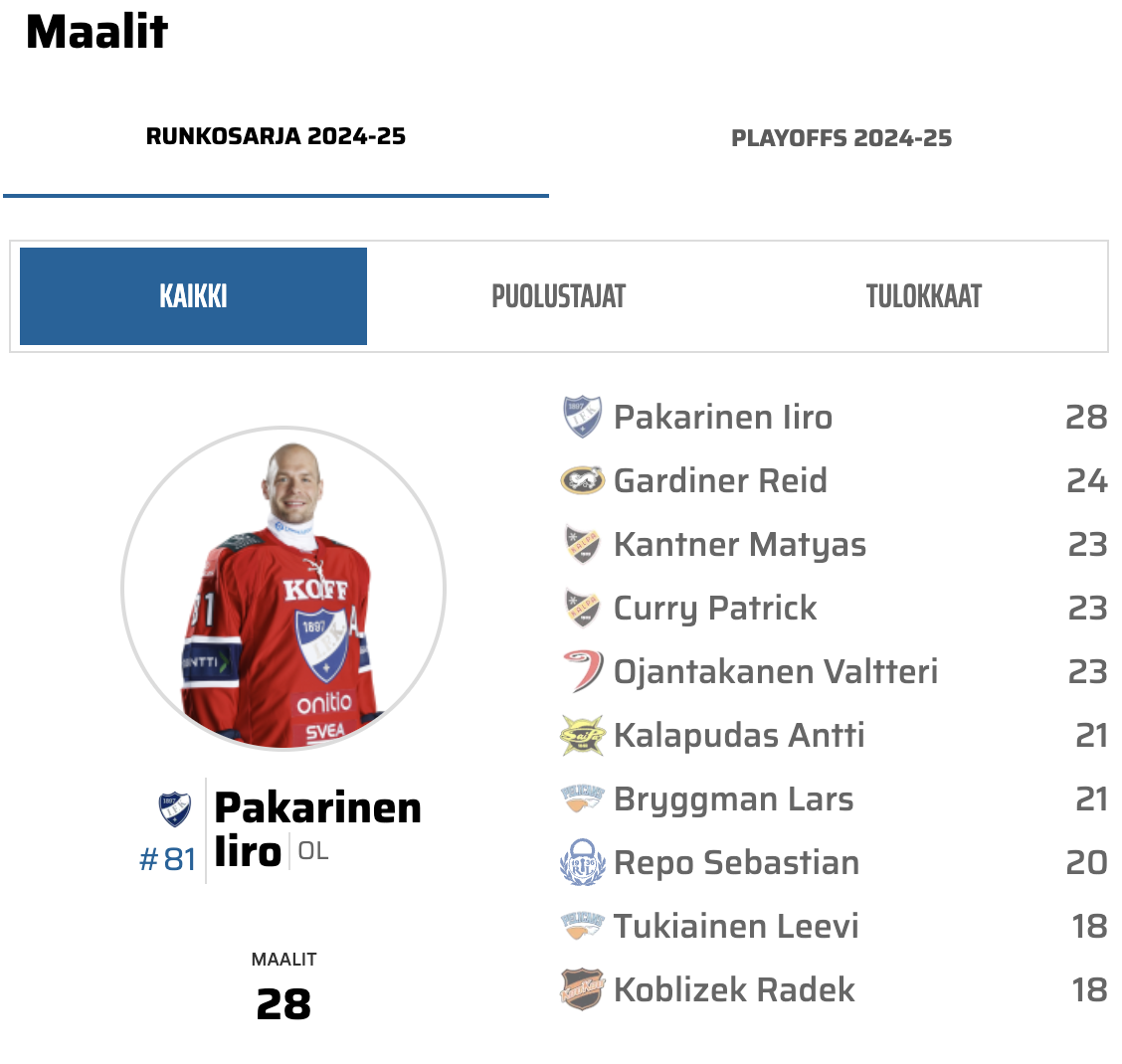 4 Niklas NykyriLoukkaantuneet/sairastuneet: Otto Somppi (day-to-day), Kasper Lundell (day-to-day), Joonas Rask (2-3 viikkoa), Jesse Seppälä (2-4 viikkoa), Kristian Vesalainen (2-3 viikkoa), Juhani Jasu (3-4 viikkoa), Leo Komarov (4 viikkoa), Petteri Nurmi (toistaiseksi)HIFK tiedottaa runkosarjan aikana loukkaantumisista pääsääntöisesti ottelupäivänä kokoonpanon julkistuksen yhteydessä. Liigan, pelaajayhdistyksen ja tietosuojavaltuutetun yhdessä laatimien sääntöjen mukaisesti pelaajien terveyteen liittyviä tietoja ei kerrota julkisuuteen. Pelaajien poissaoloista kerrotaan sen hetken arvioitu toipumisaika. Arvio saattaa muuttua toipumisaikana ja kulloinkin ilmoitetaan sen hetkinen tilanne.